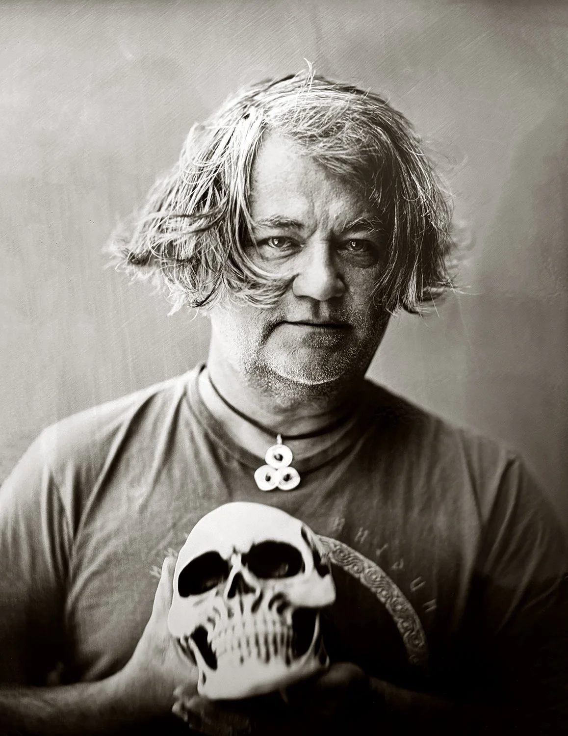 I made this portrait of a friend and fellow doctoral student as a way of staying with something we’re both circling in our work. The skull isn’t a prop so much as a confrontation. An ordinary object that carries the fact we spend most of our lives softening. In his hands, it becomes a point of contact rather than distance. What the image holds is that brief threshold where awareness sharpens and doesn’t immediately turn away, where the human effort to make meaning and the certainty of its limit sit side by side, without resolution.