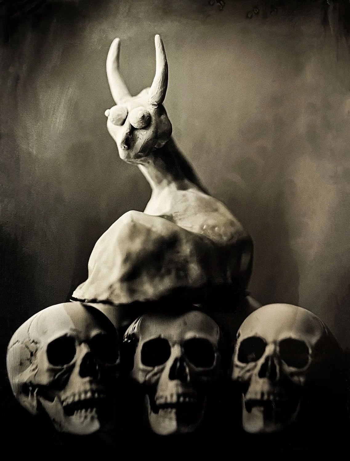 “Horned Creature on Skulls”—Half Plate Tintype