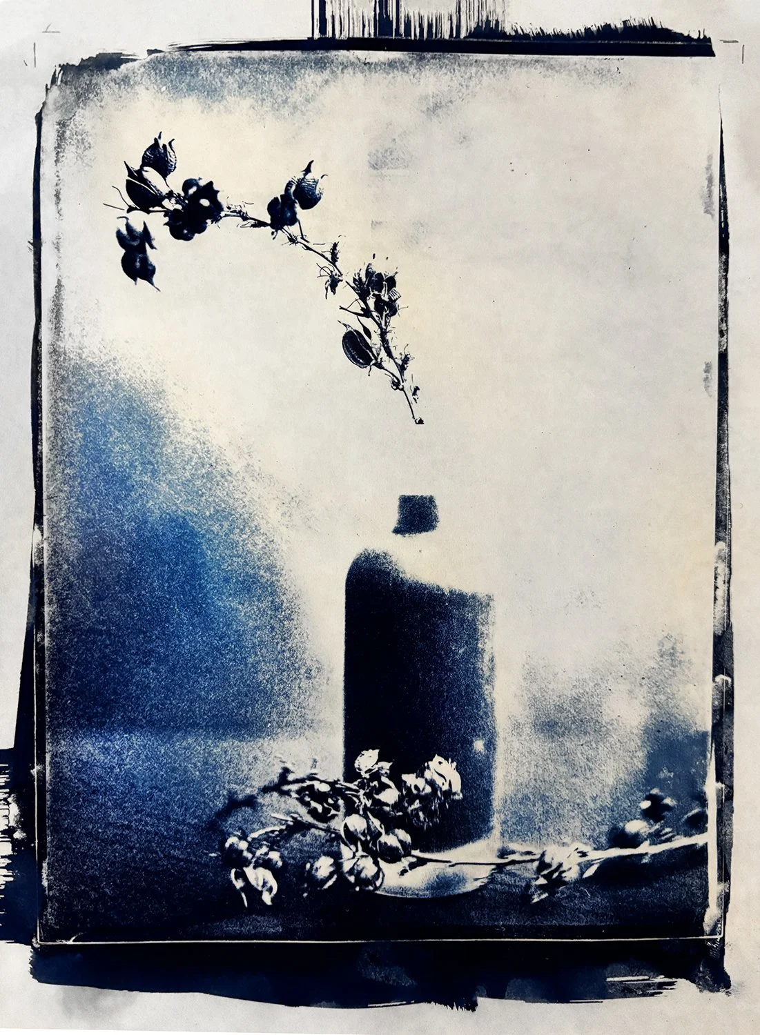 Washing sections of the print back out introduced a kind of instability into the surface. Areas that should have held firm dissolved into something closer to residue. The hydrogen peroxide, used to deepen the blues, didn’t simply “enhance” the shadows in a technical sense. It pushed the image toward a more pronounced polarity, presence and absence sitting closer together, almost uncomfortably so. What remains feels less like a fixed object and more like something that has survived a process of erosion.