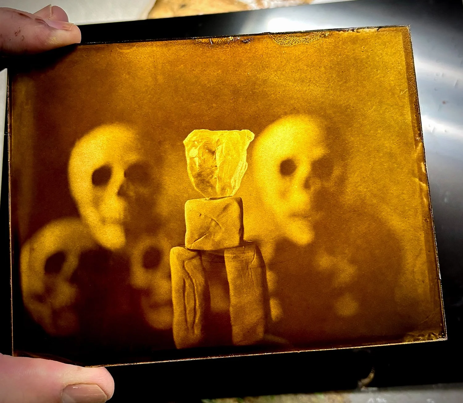 The central figure feels assembled rather than organic. Stacked. Held together. I think of it less as a subject and more as a structure, a self-constructed one under pressure. The translucence of the collodio-chloride allows it to exist somewhere between solidity and dissolution, which mirrors the psychological space I’m often working in. Identity here isn’t fixed. It’s maintained.