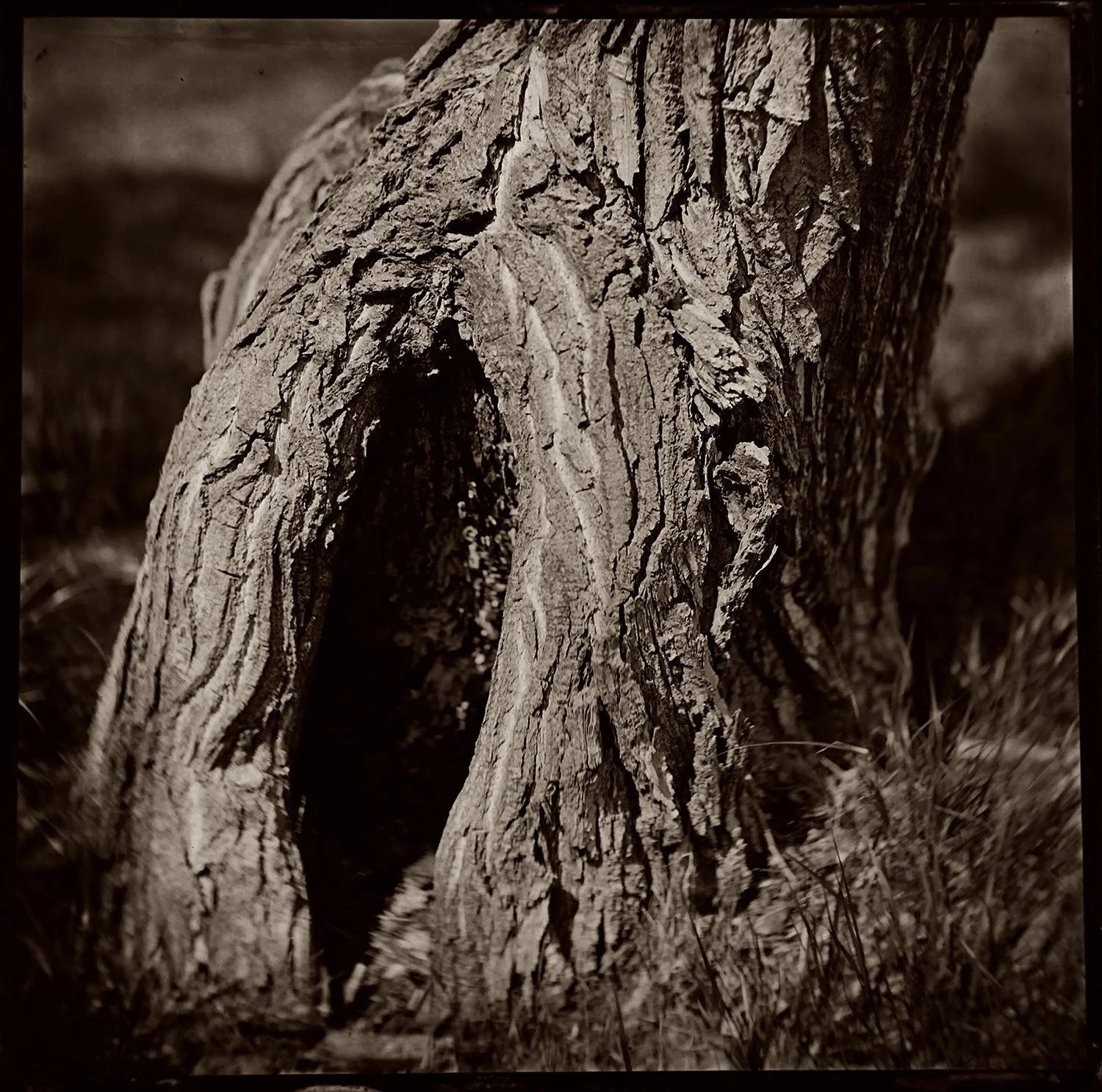 “Witness Tree, Sand Creek Massacre Site, Colorado.” 6” x 6” POP print from a wet collodion negative, 2018. Photograph by Quinn Jacobson.