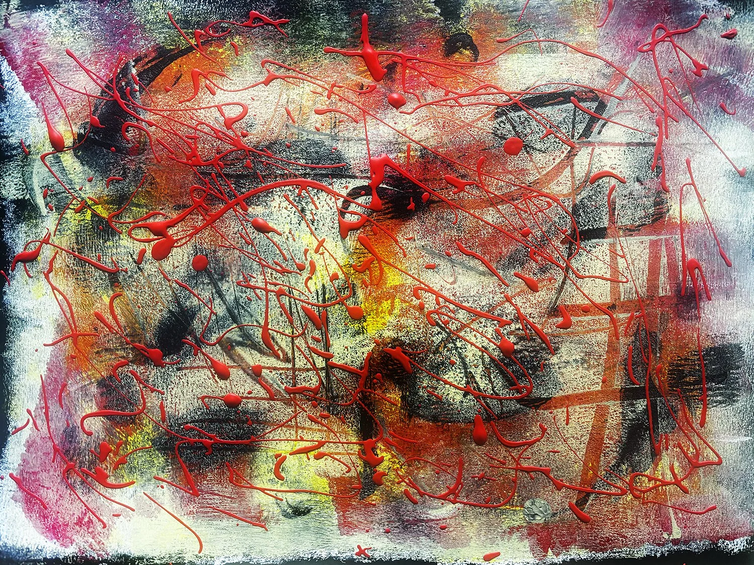 Color plays a critical role here. The red enamel is so saturated that it immediately reads as bodily, almost visceral. It suggests blood, violence, or at least some form of rupture in the membrane of the image. Against that intensity, the yellows and smoky blacks beneath it feel more atmospheric. They form a kind of ground where something might have once cohered, but the red interrupts that coherence again and again. The painting begins to feel like a record of disturbance rather than an attempt at resolution.